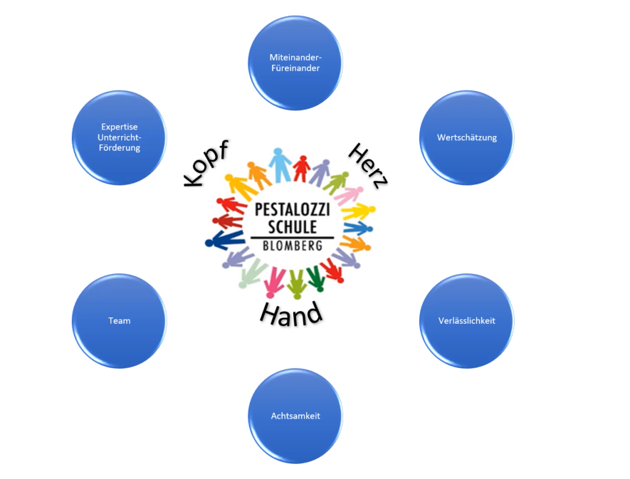 Lernen mit Kopf, Herz und Hand – das ist der Leitsatz der Pestalozzischule Blomberg. Er geht zurück auf den Namensträger der Schule. Das Grundkompetenzmodell Pestalozzis basiert auf einem ganzheitlichen Ansatz für das Lernen und Lehren und umfasst analytisches Denken („Kopf“), emotionale Intelligenz („Herz“) und Handlungsfähigkeit („Hand“).